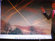 ziet u die hoge bewolking. Dit is wat lagere bewolking." [N.B. De vliegtuigstrepen (contrails) en luchtvaartsmog waren op de satelietfoto's ook heel goed te zien, maar daar wijst weerman Gerrit Hiermstra niet op.. RvW] "U ziet op de laatste foto die hoge bewolking voorbij trekken waarin de kring om de zon te zien was. Morgenmiddag gaat het vanuit het westen regenen, niet alleen bij ons, maar dat gebeurt in de omgeving ook. In Denemarken, in het zuid-westen van Scandinavie, in het westen van Frankrijk en in Belgie. En tegen de avond leverde dat in het westen van het land een prachtige zonsondergang op. Nou, een prachtige dag, die mooi begon en die ook mooi werd afgesloten." |